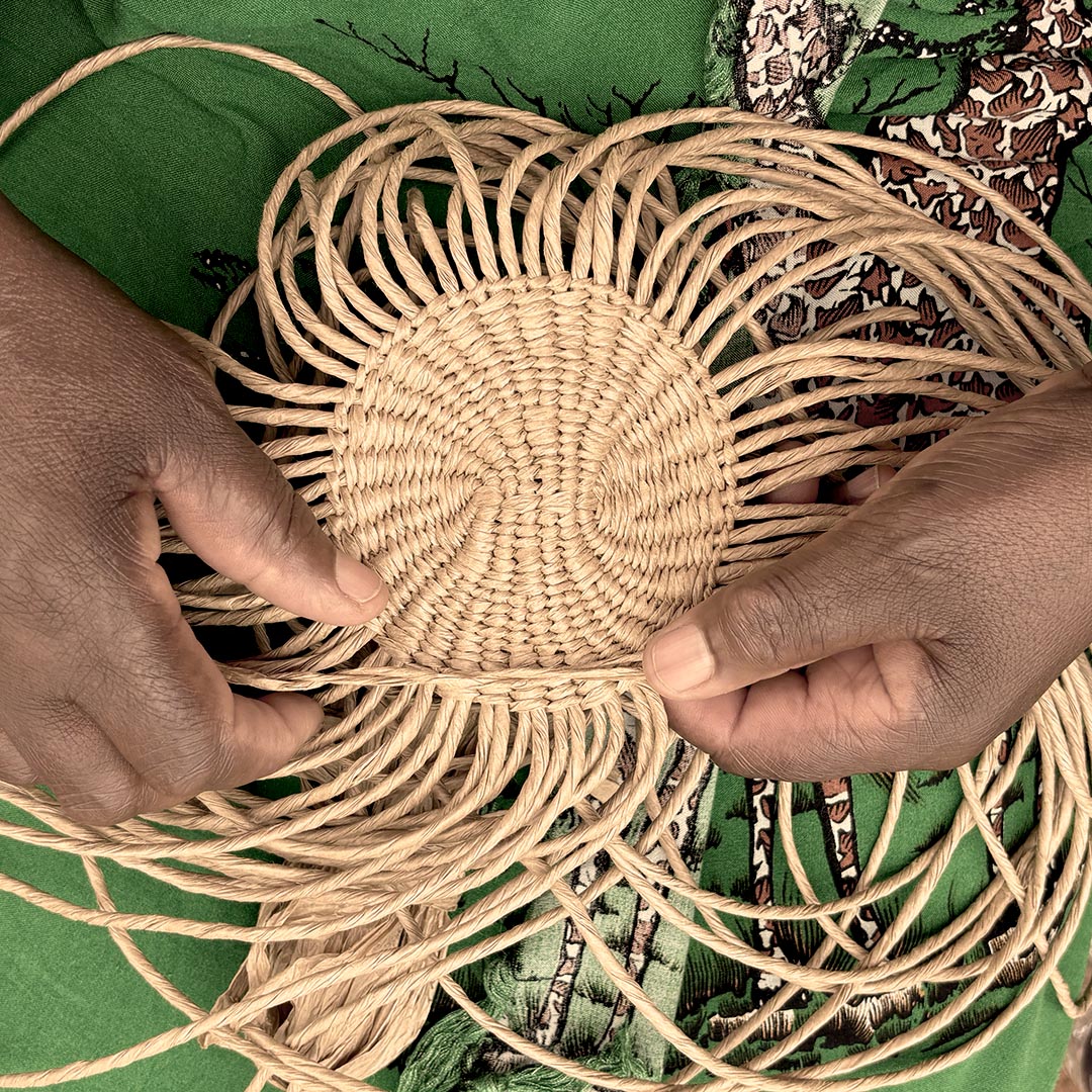 The making of a Kiondo basket begins when an artisan woman in rural Kenya crosses two long strands of twine, or warp thread, with two other long strands. Using a traditional weaving technique called lash weave, she weaves two strands over the other pair. Warp threads are added along the way, using from 50 to 100 in a basket. It takes between half a day to two days for the artisan to weave a basket. When it is finished, the surface is trimmed with scissors and the artisan’s name added to the product tag. The basket can start its journey from Kenya to Finland and from there to resellers and customers all over the world.